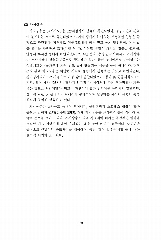 2 가시상추 가시상추는 39개시도, 총 529지점에서 생육이 확인되었다. 경상도권역 전역 에 분포하는 것으로 확인되었으며, 지역 생태계에 미치는 부정적인 영향은 클 것으로 판단된다. 지역별로 경상북도에서 더욱 빈도 높게 발견되며, 더욱 넓 은 면적을 차지하고 있다 그림 Ⅴ- 7 시도별 영천시 72지점, 청송군 44지점, 안동시 36지점 등에서 확인되었다. 2016년 전라, 충청권 조사에서도 가시상추 는 조사지역에 광역분포종으로 구분된바 있다. 금년 조사에서도 가시상추는 생태계교란식물가운에 가장 빈도 높게 관찰되는 식물종 중에 하나이다. 현장 조사 결과 가시상추는 다양한 서식처 유형에서 생육하는 것으로 확인되었다. 길가장자리가 172 지점으로 가장 많이 관찰되었으나, 공터 및 인공서식처 131 지점, 하천 제...