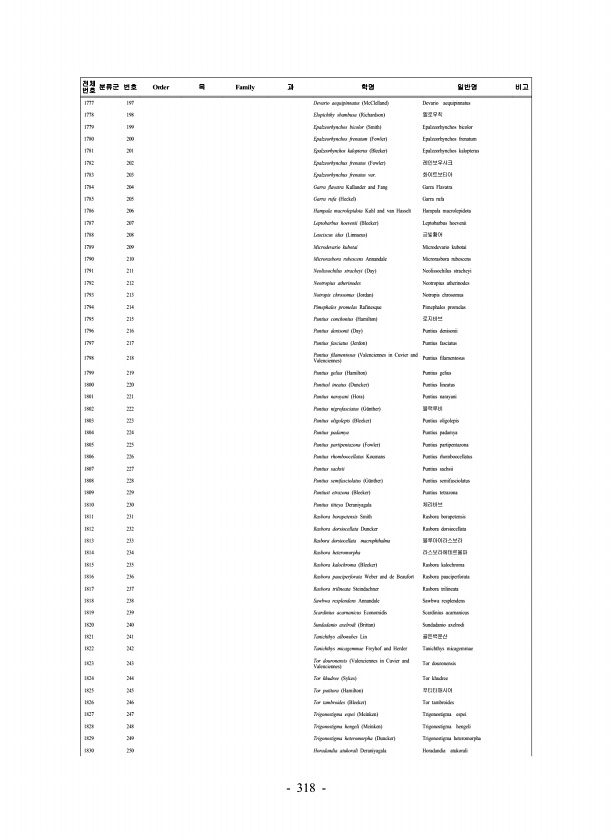 318 전체 번호 분류군 번호 Order 목 Family 과 학명 일반명 비고 1777 197 Devario aequipinnatus McClelland Devario aequipinnatus 1778 198 Elopichthy sbambusa Richardson 옐로우칙 1779 199 Epalzeorhynchos bicolor Smith Epalzeorhynchos bicolor 1780 200 Epalzeorhynchos frenatum Fowler Epalzeorhynchos frenatum 1781 201 Epalzeorhynchos kalopterus Bleeker Epalzeorhynchos kalopterus 1782 202 Epalzeorhynchus frenatus Fowler 레인보우샤크...