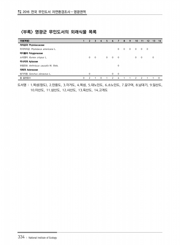 2016 전국 무인도서 자연환경조사 영광권역 334 ? National Institute of Ecology 부록 영광군 무인도서의 외래식물 목록 국명 학명 1 2 3 4 5 6 7 8 9 10 11 12 13 14 자리공과 Phytolaccaceae 미국자리공 Phytolacca americana L. 0 0 0 0 0 0 마디풀과 Polygonaceae 소리쟁이 Rumex crispus L. 0 0 0 0 0 0 0 0 미나리과 Apiaceae 유럽전호 Anthriscus caucalis M. Bieb. 0 국화과 Asteraceae 방가지똥 Sonchus oleraceus L. 0 0 0 총 출현종수 0 2 1 0 1 2 4 1 1 2 2 1 1 0 도서명 1.목섬 항도 , 2.만풍도, 3.각거도, 4...