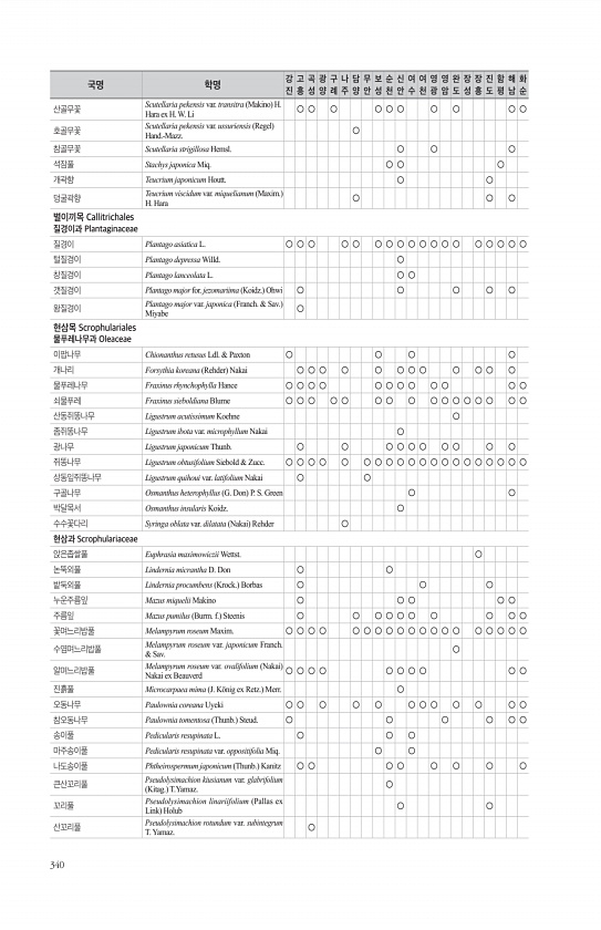 340 산골무꽃 Scutellaria pekensis var. transitra Makino H. Hara ex H. W. Li ○ ○ ○ ○ ○ ○ ○ ○ ○ ○ 호골무꽃 Scutellaria pekensis var. ussuriensis Regel Hand.-Mazz. ○ 참골무꽃 Scutellaria strigillosa Hemsl. ○ ○ ○ 석잠풀 Stachys japonica Miq. ○ ○ ○ 개곽향 Teucrium japonicum Houtt. ○ ○ 덩굴곽향 Teucrium viscidum var. miquelianum Maxim. H. Hara ○ ○ ○ 별이끼목 Callitrichales 질경이과 Plantaginaceae 질경이 Plantago asiatica L. ○ ○ ○ ○ ○ ○...