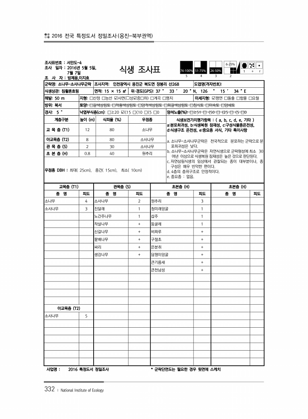 2016 전국 특정도서 정밀조사 옹진-북부권역 332 ? National Institute of Ecology 조사표번호 서만도-4 조사 일자 2016년 5월 5일, 7월 7일 조 사 자 방제용,이지효 식생 조사표 군락명소나무-소사나무군락 조사지역인천광역시 옹진군 북도면 장봉리 산268 도엽명 격자번호 식생상관침활혼효림 면적15 × 15 ㎡ 위·경도 GPS 37 ° 33 ′ 20 ″N, 126 ° 15 ′ 34 ″E 해발50 m 지형□산정 □능선 ?사면 ?상?중□하 □계곡 □평지 미세지형?평면 □돌출 □함몰 □요철 방위북서 토양□갈색삼림토 □적황색삼림토 □암적색삼림토 □회갈색삼림토 □침식토 □미숙토 □암쇄토 경사5 ° 낙엽부식층 cm □≥20 ? 15 □ 10 □ 5 □0 암석노출 % □≥51 □〈50 □〈...