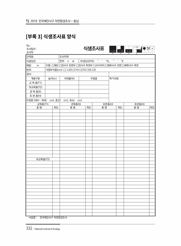 2018 전국해안사구 자연환경조사 충남 332 ? National Institute of Ecology [ 3] No 조사일자 조사자식생조사표 군락명조사지역식생상관면적× ㎡ 위?경도 GPS ° ′ ″N, ° ′ E 해발m 지형□해빈 □전사구 전면부 □전사구 후면부 □사구저지 □배후사구 전면 □배후사구 후면 방위낙엽부식층 cm □.≥20 □ 15 □ 10 □ 5 □0 경사계층구분 높이 m 식피율 % 우점종 특기사항교 목 층 T1 아교목층 T2 관 목 층 S 초 본 층 H 우점종 DBH 최대 cm , 중간 cm , 최소 cm 교목층 T1 관목층 S 초본층 H 초본층 H 종 명 피도 종 명 피도 종 명 피도 종 명 피도 아교목층 T2 사업명 전국해안사구자연환경조사