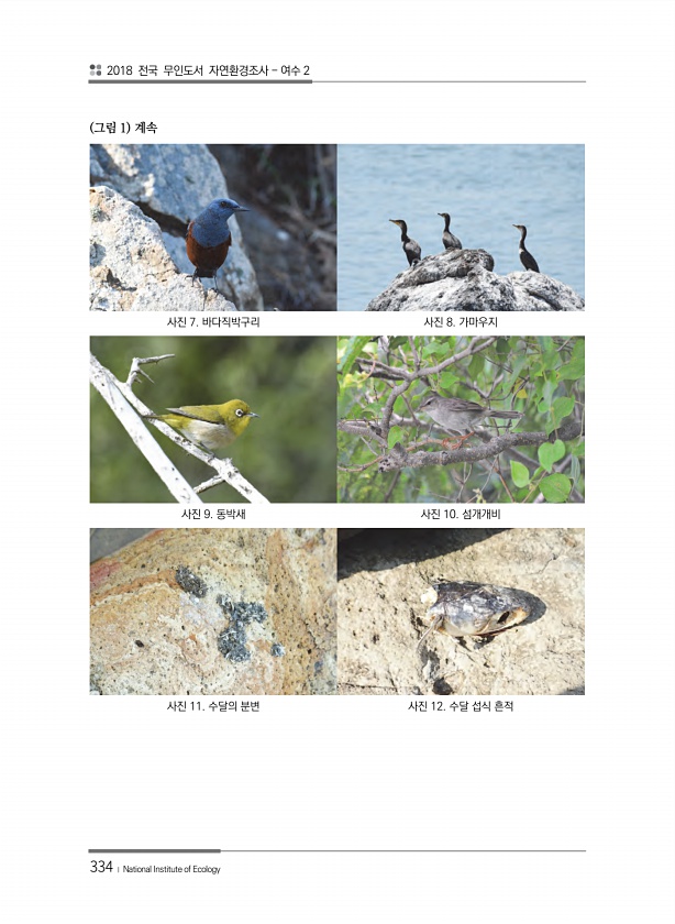 2018 전국 무인도서 자연환경조사 여수 2 334 ? National Institute of Ecology 사진 7. 바다직박구리 사진 8. 가마우지 사진 9. 동박새 사진 10. 섬개개비 사진 11. 수달의 분변 사진 12. 수달 섭식 흔적 그림 1계속