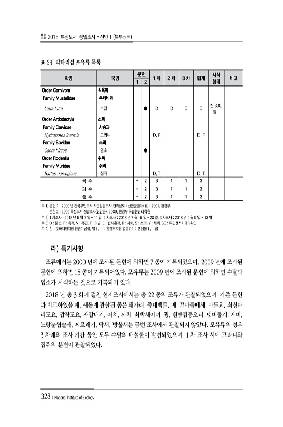 2018 특정도서 정밀조사 신안 1 북부권역 328 ? National Institute of Ecology 학명 국명 문헌 1 차 2 차 3 차 합계 서식 1 2 형태 비고 Order Carnivora 식육목 Family Mustelidae 족제비과 Lutra lutra 수달 ● D D D D 천 330, 멸Ⅰ Order Artiodactyla 소목 Family Cervidae 사슴과 Hydropotes inermis 고라니 D, F D, F Family Bovidae 소과 Capra hircus 염소 ● Order Rodentia 쥐목 Family Muridae 쥐과 Rattus norvegicus 집쥐 D, T D, T 목 수 2 3 1 1 3 과 수 2 3 1 1 3 종 수 2 3 1 1 3 표 63...