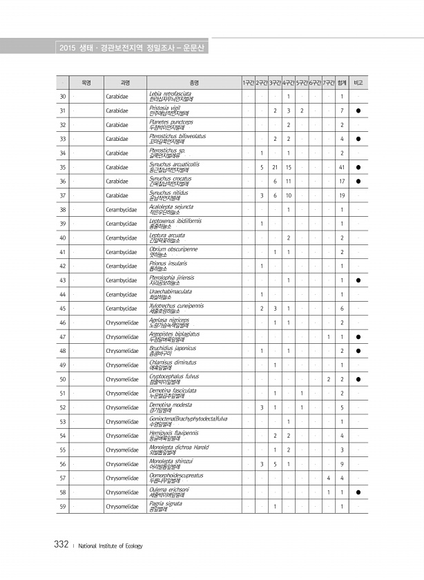 2015 생태·경관보전지역 정밀조사 운문산 332 ? National Institute of Ecology 목명 과명 종명 1구간 2구간 3구간 4구간 5구간 6구간 7구간 합계 비고 30 Carabidae Lebia retrofasciata 한라십자무늬먼지벌레 1 1 31 Carabidae Pristosia vigil 만주애납작먼지벌레 2 3 2 7 ● 32 Carabidae Planetes punctceps 두점박이먼지벌레 2 2 33 Carabidae Pterostichus bifoveolatus 꼬마길쭉먼지벌레 2 2 4 ● 34 Carabidae Pterostichus sp. 길쭉먼지벌레류 ...