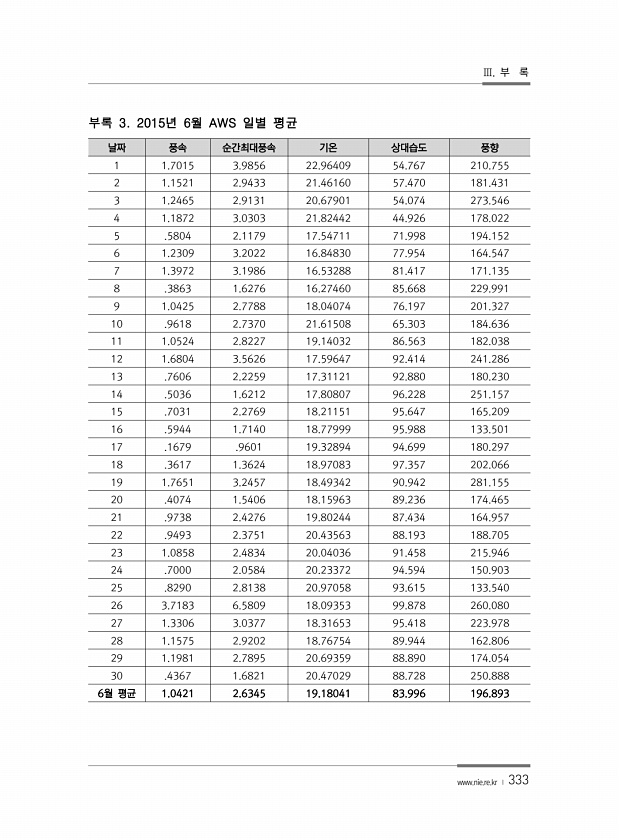 Ⅲ. 부 록 www.nie.re.kr ? 333 날짜 풍속 순간최대풍속 기온 상대습도 풍향 1 1.7015 3.9856 22.96409 54.767 210.755 2 1.1521 2.9433 21.46160 57.470 181.431 3 1.2465 2.9131 20.67901 54.074 273.546 4 1.1872 3.0303 21.82442 44.926 178.022 5 .5804 2.1179 17.54711 71.998 194.152 6 1.2309 3.2022 16.84830 77.954 164.547 7 1.3972 3.1986 16.53288 81.417 171.135 8 .3863 1.6276 16.27460 85.668 229.991 9 1.0425 2.7788 18.04074 76.197...