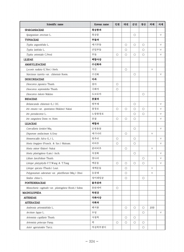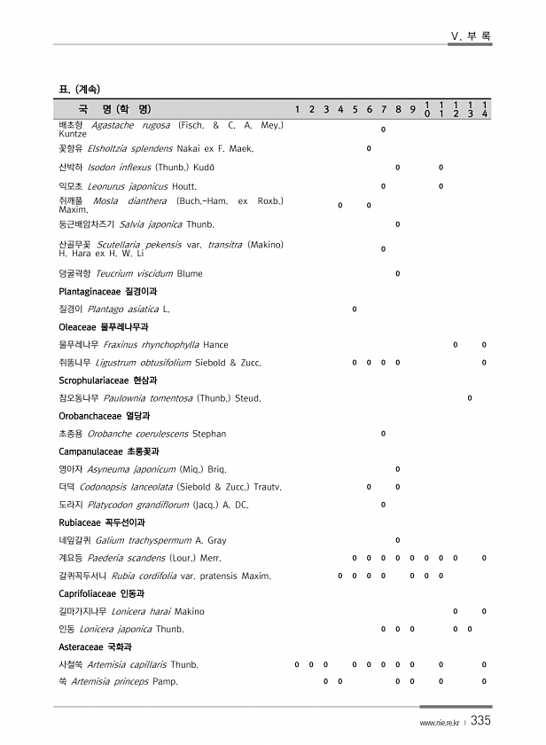 Ⅴ. 부 록 www.nie.re.kr ? 335 표. 계속 국 명 학 명 1 2 3 4 5 6 7 8 9 1 0 1 1 1 2 1 3 1 4 배초향 Agastache rugosa Fisch. & C. A. Mey. Kuntze 0 꽃향유 Elsholtzia splendens Nakai ex F. Maek. 0 산박하 Isodon inflexus Thunb. Kudo? 0 0 익모초 Leonurus japonicus Houtt. 0 0 쥐깨풀 Mosla dianthera Buch.-Ham. ex Roxb. Maxim. 0 0 둥근배암차즈기 Salvia japonica Thunb. 0 산골무꽃 Scutellaria pekensis var. transitra Makino H. Hara ex H. W. Li 0 덩...