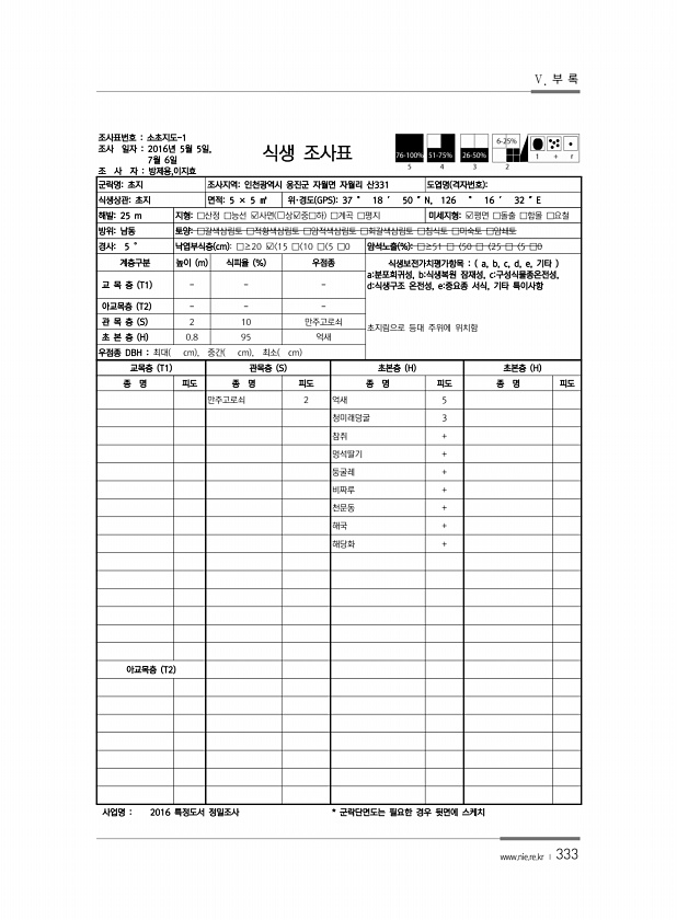 Ⅴ. 부 록 www.nie.re.kr ? 333 조사표번호 소초지도-1 조사 일자 2016년 5월 5일, 7월 6일 조 사 자 방제용,이지효 식생 조사표 군락명초지 조사지역인천광역시 옹진군 자월면 자월리 산331 도엽명 격자번호 식생상관초지 면적5 × 5 ㎡ 위·경도 GPS 37 ° 18 ′ 50 ″N, 126 ° 16 ′ 32 ″E 해발25 m 지형□산정 □능선 ?사면 ?상?중□하 □계곡 □평지 미세지형?평면 □돌출 □함몰 □요철 방위남동 토양□갈색삼림토 □적황색삼림토 □암적색삼림토 □회갈색삼림토 □침식토 □미숙토 □암쇄토 경사5 ° 낙엽부식층 cm □≥20 ? 15 □ 10 □ 5 □0 암석노출 % □≥51 □〈50 □〈25 □〈5 □0 계층구분 높이 m 식피율 % 우점종 식생보전가치평가항목 a, b, ...