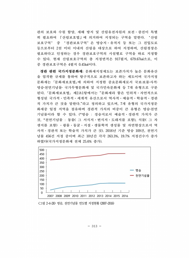 313 관의 보호와 수원 함양, 재해 방지 및 산림유전자원의 보전·증진이 특별 히 필요하여 「산림보호법」에 의거하여 지정되는 구역을 말한다. ‘산림 보호구역’ 중 ‘경관보호구역’은 명승지·유적지 등 또는 그 진입도로 등으로부터 2천 미터 이내의 산림을 대상으로 하여 지정하며, 산림청장은 필요하다고 인정하는 경우 경관보호구역의 시설별로 구역을 따로 지정할 수 있다. 현재 산림보호구역의 총 지정면적은 917필지, 679.67㎢으로, 이 중 경관보호구역은 4필지 0.45㎢이다. 경관 관련 국가지정문화재문화재지정제도는 보존가치가 높은 문화유산 을 엄격한 규제를 통하여 항구적으로 보존하고자 하는 제도이며 국가지정 문화재는 ?문화재보호법?에 의하여 지정한 중요문화재로서 국보?보물?사적? 명승?천연기념물? 국가무형문화재...