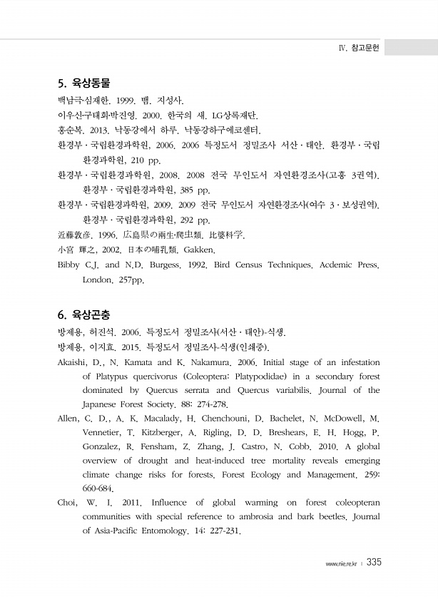 Ⅳ. 참고문헌 www.nie.re.kr ? 335 5. 육상동물 백남극?심재한. 1999. 뱀. 지성사. 이우신?구태회?박진영. 2000. 한국의 새. LG상록재단. 홍순복. 2013. 낙동강에서 하루. 낙동강하구에코센터. 환경부·국립환경과학원, 2006. 2006 특정도서 정밀조사 서산·태안. 환경부·국립 환경과학원, 210 pp. 환경부·국립환경과학원, 2008. 2008 전국 무인도서 자연환경조사 고흥 3권역 환경부·국립환경과학원, 385 pp. 환경부·국립환경과학원, 2009. 2009 전국 무인도서 자연환경조사 여수 3·보성권역 환경부·국립환경과학원, 292 pp. 近藤敦彦. 1996. ?島?の兩生?爬?類. 比婆科?. 小宮 輝之, 2002. 日本の哺乳類. Gakken. Bibby C.J. and N...