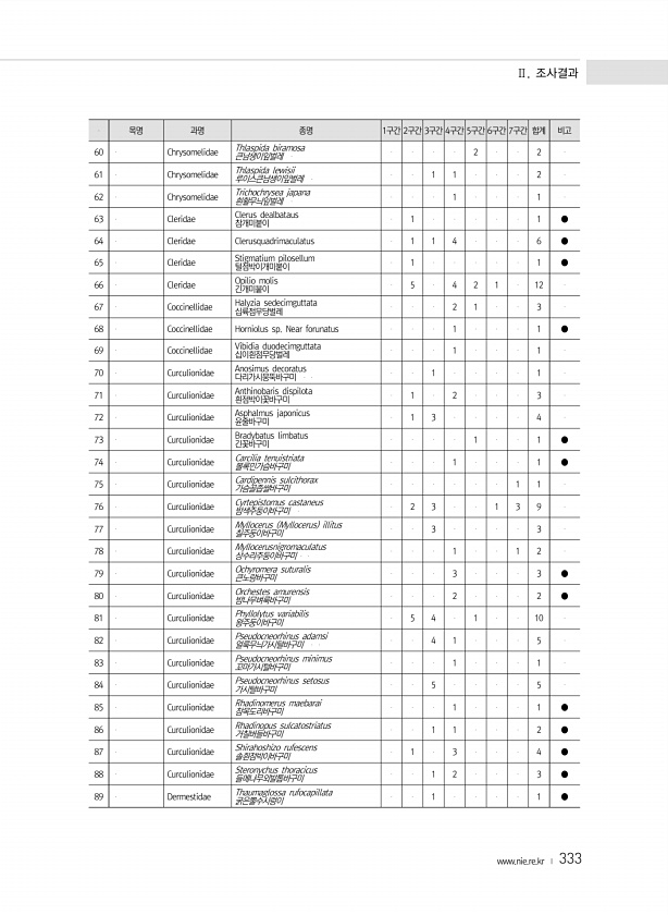 Ⅱ. 조사결과 www.nie.re.kr ? 333 목명 과명 종명 1구간 2구간 3구간 4구간 5구간 6구간 7구간 합계 비고 60 Chrysomelidae Thlaspida biramosa 큰남생이잎벌레 2 2 61 Chrysomelidae Thlaspida lewisii 루이스큰남생이잎벌레 1 1 2 62 Chrysomelidae Trichochrysea japana 흰활무늬잎벌레 1 1 63 Cleridae Clerus dealbataus 참개미붙이 1 1 ● 64 Cleridae Clerusquadrimaculatus 1 1 4 6 ● 65 Cleridae Sti...