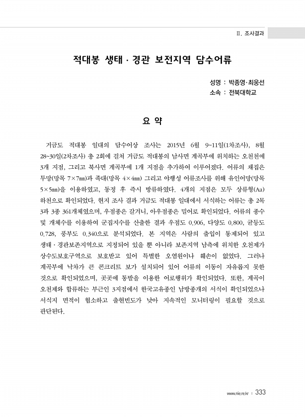 Ⅱ. 조사결과 www.nie.re.kr ? 333 적대봉 생태·경관 보전지역 담수어류 성명 박종영·최웅선 소속 전북대학교 요 약 거금도 적대봉 일대의 담수어상 조사는 2015년 6월 911일 1차조사 , 8월 2830일 2차조사 총 2회에 걸쳐 거금도 적대봉의 남사면 계곡부에 위치하는 오천천에 3개 지점, 그리고 북사면 계곡부에 1개 지점을 추가하여 이루어졌다. 어류의 채집은 투망 망목 7×7㎜ 과 족대 망목 4×4㎜ 그리고 야행성 어류조사를 위해 유인어망 망목 5×5㎜ 을 이용하였고, 동정 후 즉시 방류하였다. 4개의 지점은 모두 상류형 Aa 하천으로 확인되었다. 현지 조사 결과 거금도 적대봉 일대에서 서식하는 어류는 총 2목 3과 3종 361개체였으며, 우점종은 갈겨니, 아우점종은 밀어로 확인되었다. 어...