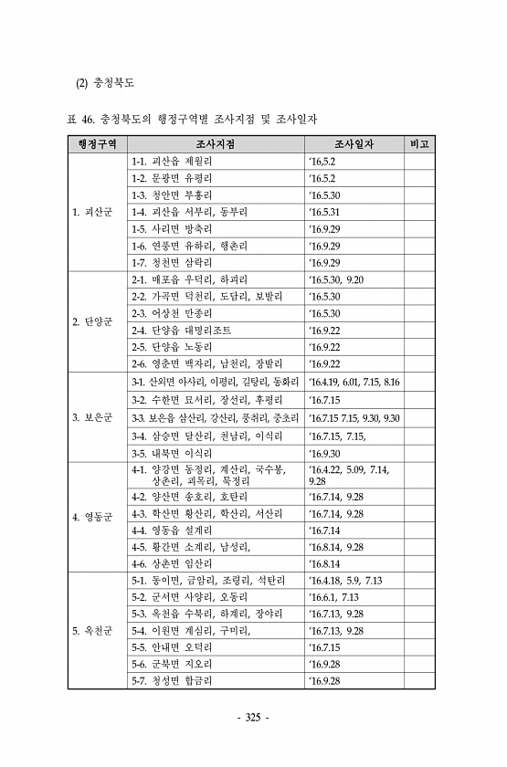 325 행정구역 조사지점 조사일자 비고 1. 괴산군 1-1. 괴산읍 제월리 ‘16,5.2 1-2. 문광면 유평리 ‘16.5.2 1-3. 청안면 부흥리 ‘16.5.30 1-4. 괴산읍 서부리, 동부리 ‘16.5.31 1-5. 사리면 방축리 ‘16.9.29 1-6. 연풍면 유하리, 행촌리 ‘16.9.29 1-7. 청천면 삼락리 ‘16.9.29 2. 단양군 2-1. 매포읍 우덕리, 하괴리 ‘16.5.30, 9.20 2-2. 가곡면 덕천리, 도담리, 보발리 ‘16.5.30 2-3. 어상천 만종리 ‘16.5.30 2-4. 단양읍 대명리조트 ‘16.9.22 2-5. 단양읍 노동리 ‘16.9.22 2-6. 영춘면 백자리, 남천리, 장발리 ‘16.9.22 3. 보은군 3-1. 산외면 아사리, 이평리, 길탕리, 동화리 ‘1...