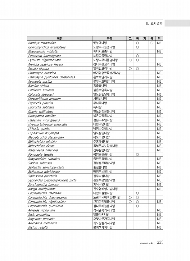 Ⅱ. 조사결과 www.nie.re.kr ? 335 학명 국명 고 국 기 특 적 Bombyx mandarina 멧누에나방 ○ ○ NE Goniorhynchus exemplaris 노랑무늬들명나방 ○ Neopediasia mixtalis 깨다시포충나방 NE Piletocera luteosignata 노랑띠들명나방 ○ Pyrausta nigrimaculata 노랑띠무늬들명나방 ○ ○ Agnidra scabiosa fixseni 참나무갈고리나방 NE Auzata nigrata 얼룩갈고리나방 ○ ○ Habrosyne aurorina 애기담홍뾰족날개나방 NE Habrosyne pyritoides derasoides 흰뾰족날개나방 NE Aventiola pusilla 꽃무늬꼬마밤나방 NE Barsine striata 홍...