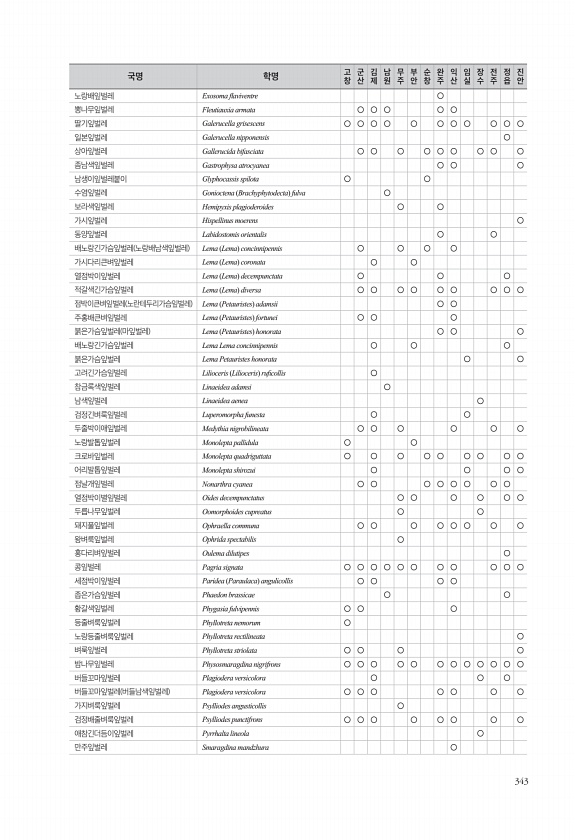 343 노랑배잎벌레 Exosoma faviventre ○ 뽕나무잎벌레 Fleutiauxia armata ○ ○ ○ ○ ○ 딸기잎벌레 Galerucella grisescens ○ ○ ○ ○ ○ ○ ○ ○ ○ ○ ○ 일본잎벌레 Galerucella nipponensis ○ 상아잎벌레 Gallerucida bifasciata ○ ○ ○ ○ ○ ○ ○ ○ ○ 좀남색잎벌레 Gastrophysa atrocyanea ○ ○ ○ 남생이잎벌레붙이 Glyphocassis spilota ○ ○ 수염잎벌레 Gonioctena Brachyphytodecta fulva ○ 보라색잎벌레 Hemipyxis plagioderoides ○ ○ 가시잎벌레 Hispellinus moerens ○ 동양잎벌레 Labidostomis orienta...