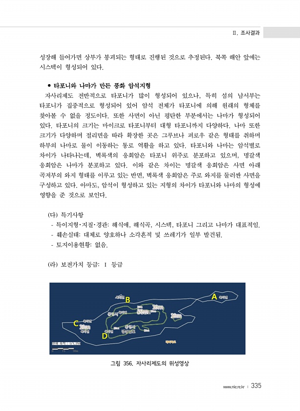 Ⅱ. 조사결과 www.nie.re.kr ? 335 성장해 들어가면 상부가 붕괴되는 형태로 진행된 것으로 추정된다. 북쪽 해안 앞에는 시스텍이 형성되어 있다. ? 타포니와 나마가 만든 풍화 암석지형 자사리제도 전반적으로 타포니가 많이 형성되어 있으나, 특히 섬의 남서부는 타포니가 집중적으로 형성되어 있어 암석 전체가 타포니에 의해 원래의 형체를 찾아볼 수 없을 정도이다. 또한 사면이 아닌 평탄한 부분에서는 나마가 형성되어 있다. 타포니의 크기는 마이크로 타포니부터 대형 타포니까지 다양하다. 나마 또한 크기가 다양하며 절리면을 따라 확장한 곳은 그루브나 퍼로우 같은 형태를 취하며 하부의 나마로 물이 이동하는 통로 역활을 하고 있다. 타포니와 나마는 암석별로 차이가 나타나는데, 벽록색의 응회암은 타포니 위주로 분...