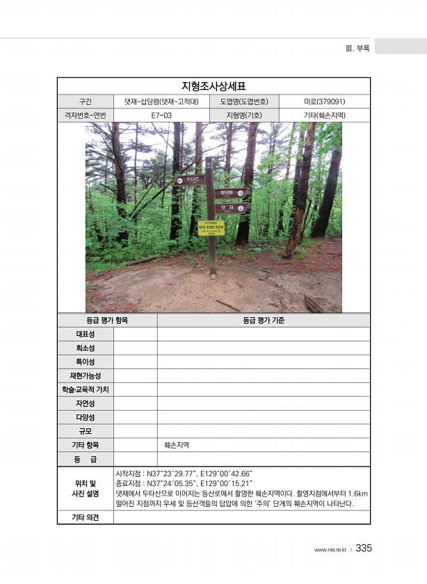 Ⅲ. 부록 www.nie.re.kr ? 335 지형조사상세표 구간 댓재삽당령 댓재고적대 도엽명 도엽번호 미로 379091 격자번호-연번 E7-03 지형명 기호 기타 훼손지역 등급 평가 항목 등급 평가 기준 대표성 희소성 특이성 재현가능성 학술?교육적 가치 자연성 다양성 규모 기타 항목 훼손지역 등 급 위치 및 사진 설명 시작지점 N37°23′29.77″, E129°00′42.66″ 종료지점 N37°24′05.35″, E129°00′15.21″ 댓재에서 두타산으로 이어지는 등산로에서 촬영한 훼손지역이다. 촬영지점에서부터 1.6km 떨어진 지점까지 우세 및 등산객들의 답압에 의한 ‘주의’ 단계의 훼손지역이 나타난다. 기타의견