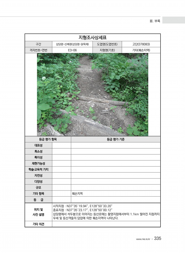 Ⅲ. 부록 www.nie.re.kr ? 335 지형조사상세표 구간 삽당령신배령 삽당령닭목재 도엽명 도엽번호 고단 378083 격자번호-연번 E3-06 지형명 기호 기타 훼손지역 등급 평가 항목 등급 평가 기준 대표성 희소성 특이성 재현가능성 학술?교육적 가치 자연성 다양성 규모 기타 항목 훼손지역 등 급 위치 및 사진 설명 시작지점 N37°35′19.94″, E128°50′33.20″ 종료지점 N37°35′23.17″, E128°50′00.12″ 삽당령에서 석두봉으로 이어지는 등산로에는 촬영지점에서부터 1.1km 떨어진 지점까지 우세 및 등산객들의 답압에 의한 훼손지역이 나타난다. 기타의견