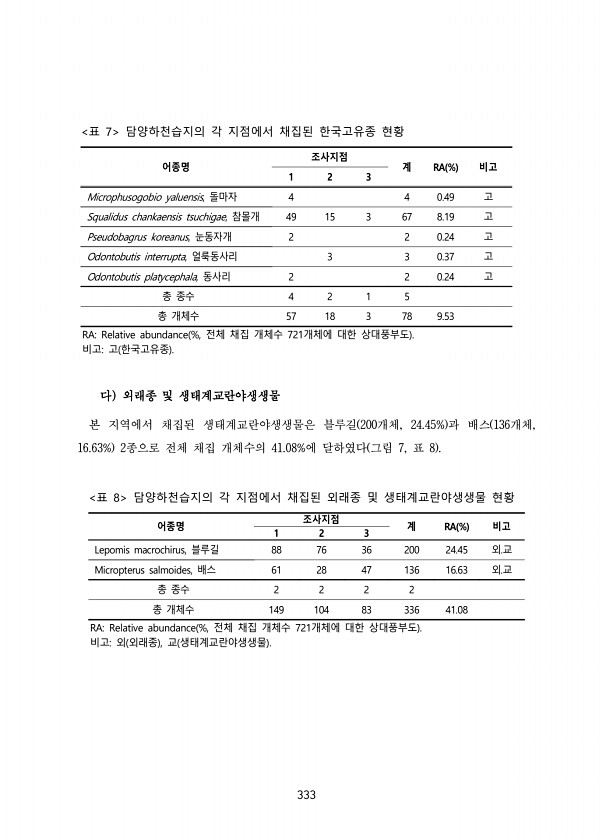 333 어종명 조사지점 계 RA % 비고 1 2 3 Microphusogobio yaluensis, 돌마자 4 4 0.49 고 Squalidus chankaensis tsuchigae, 참몰개 49 15 3 67 8.19 고 Pseudobagrus koreanus, 눈동자개 2 2 0.24 고 Odontobutis interrupta, 얼룩동사리 3 3 0.37 고 Odontobutis platycephala, 동사리 2 2 0.24 고 총 종수 4 2 1 5 총 개체수 57 18 3 78 9.53 RARelative abundance %, 전체 채집 개체수 721개체에 대한 상대풍부도 비고고 한국고유종 표 7 담양하천습지의 각 지점에서 채집된 한국고유종 현황 다 외래종 및 생태계교란야생생물 본 지역에서 채...