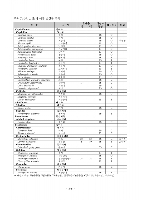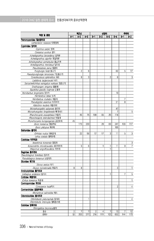 2018 DMZ 일원 생태계 조사 민통선이북지역 중부산악권역 336 ? National Institute of Ecology 학명 및 종명 적근산 산양리 주파리 4-1 4-2 4-3 5-1 5-2 5-3 5-4 6-1 6-2 Petromyzonidae 칠성장어과 Lethenteron reissneri 다묵장어 Cyprinidae 잉어과 Cyprinus carpio 잉어 Carassius auratus 붕어 Acheilognathus lanceolatus 납자루 Acheilognathus signifer 묵납자루 Acheilognathus yamatsutae 줄납자루 Acheilognathus rhombeus 납지리 Pseudorasbora parva 참붕어 Pungtungia herzi 돌고기 2 6 62 ...