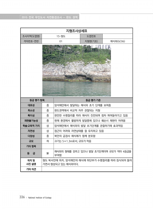 2015 전국 무인도서 자연환경조사 완도 권역 336 ? National Institute of Ecology 지형조사상세표 조사지역 도엽명 15-형도 도엽번호 격자번호-연번 01 지형명 기호 해식와 GC06 등급 평가 항목 등급 평가 기준 대표성 중 암석해안에서 발달하는 해식와 초기 단계를 보여줌 희소성 중 완도권역에서 비교적 자주 관찰되는 지형 특이성 중 완만한 수평절리를 따라 해식이 진전되며 점차 파여들어가고 있음 재현불가능성 중 현재 환경에서 활발하게 발달중에 있으나 훼손시 재현이 어려움 학술?교육적 가치 상 암석해안에서 해식와의 발달 초기단계를 관찰하기에 효과적임 자연성 상 접근이 어려워 자연상태를 잘 유지하고 있음 다양성 중 북안의 급경사 해식애가 함께 분포함 규모 하 크기는 5×1.3m로서, 규...