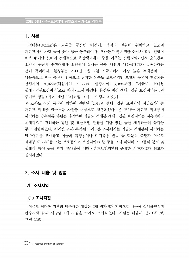 2015 생태·경관보전지역 정밀조사 거금도 적대봉 334 ? National Institute of Ecology 1. 서론 적대봉 592.2m 은 고흥군 금산면 어전리, 석정리 일원에 위치하고 있으며 거금도에서 가장 높이 솟아 있는 봉우리이다. 적대봉은 펑퍼짐한 산세와 달리 전망이 매우 뛰어난 산이며 전체적으로 육상생태계가 주를 이루는 산림지역이면서 오천천과 오천제 주변의 수생태계와 오천천이 끝나는 주변 해안의 해양생태계가 공존한다는 점이 특이하다. 환경부는 2011년 1월 7일 거금도에서 가장 높은 적대봉과 그 남동쪽으로 뻗은 능선의 안쪽으로 위치한 상수도 보호구역인 오천제 유역이 연결되는 산림지역 8.365㎢ 핵심지역 5.177㎢, 완충지역 3.188㎢ 를 “거금도 적대봉 생태·경관보전지역”으로 지정·...
