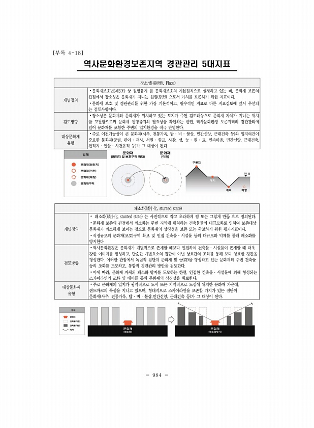 984 [부록 4-18] 역사문화환경보존지역 경관관리 5대지표 장소성 場所性, Place 개념정의 ?문화재보호법 제3조 상 원형유지 를 문화재보호의 기본원칙으로 설정하고 있는 바, 문화재 보존의 관점에서 장소성은 문화재가 지니는 원형 原形 으로서 가치를 보존하기 위한 지표이다. ?문화재 보호 및 경관관리를 위한 가장 기본적이고, 필수적인 지표로 다른 지표검토에 앞서 우선되 는 검토사항이다. 검토방향 ?장소성은 문화재와 문화재가 위치하고 있는 토지가 주된 검토대상으로 문화재 자체가 지니는 위치 를 고찰함으로써 문화재 원형유지의 필요성을 확인하는 한편, 역사문화환경 보존지역의 경관관리에 있어 문화재를 포함한 주변의 입지환경을 적극 반영한다. 대상문화재 유형 ?주로 이전가능성이 큰 문화재 사우, 전통가옥, 탑 ?...