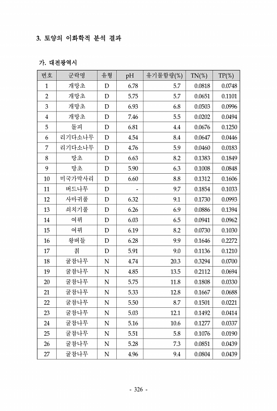 번호 군락명 유형 pH 유기물함량 % TN % TP % 1 개망초 D 6.78 5.7 0.0818 0.0748 2 개망초 D 5.75 5.7 0.0651 0.1101 3 개망초 D 6.93 6.8 0.0503 0.0996 4 개망초 D 7.46 5.5 0.0202 0.0494 5 돌피 D 6.81 4.4 0.0676 0.1250 6 리기다소나무 D 4.54 8.4 0.0647 0.0446 7 리기다소나무 D 4.76 5.9 0.0460 0.0183 8 망초 D 6.63 8.2 0.1383 0.1849 9 망초 D 5.90 6.3 0.1008 0.0848 10 미국가막사리 D 6.60 8.8 0.1312 0.1606 11 버드나무 D 9.7 0.1854 0.1033 12 사마귀풀 D 6.32 9.1 0.173...