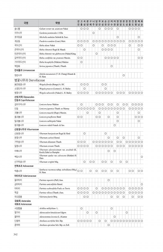 342 솔나물 Galium verum var. asiaticum Nakai ○ ○ ○ ○ ○ ○ ○ ○ ○ ○ ○ ○ 치자나무 Gardenia jasminoides J. Ellis ○ 호자덩굴 Mitchella undulata Siebold & Zucc. ○ ○ 계요등 Paederia scandens Lour. Merr. ○ ○ ○ ○ ○ ○ ○ ○ ○ ○ ○ ○ ○ ○ ○ ○ ○ ○ ○ ○ 꼭두선이 Rubia akane Nakai ○ ○ ○ ○ ○ ○ ○ ○ ○ ○ 큰꼭두선이 Rubia chinensis Regel & Maack ○ ○ ○ ○ ○ ○ 민큰꼭두선이 Rubia chinensis var. glabrescens Nakai Kitag. ○ 갈퀴꼭두선이 Rubia cordifolia var. prat...