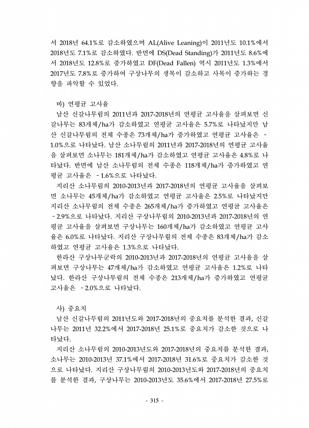 315 서 2018년 64.1%로 감소하였으며 AL Alive Leaning 이 2011년도 10.1%에서 2018년도 7.1%로 감소하였다. 반면에 DS Dead Standing 가 2011년도 8.6%에 서 2018년도 12.8%로 증가하였고 DF Dead Fallen 역시 2011년도 1.3%에서 2017년도 7.8%로 증가하여 구상나무의 생목이 감소하고 사목이 증가하는 경 향을 파악할 수 있었다. 바 연평균 고사율 남산 신갈나무림의 2011년과 2017-2018년의 연평균 고사율을 살펴보면 신 갈나무는 83개체/ha가 감소하였고 연평균 고사율은 5.7%로 나타났지만 남 산 신갈나무림의 전체 수종은 73개체/ha가 증가하였고 연평균 고사율은 ? 1.0%으로 나타났다. 남산 소나무림의 2011년과 201...