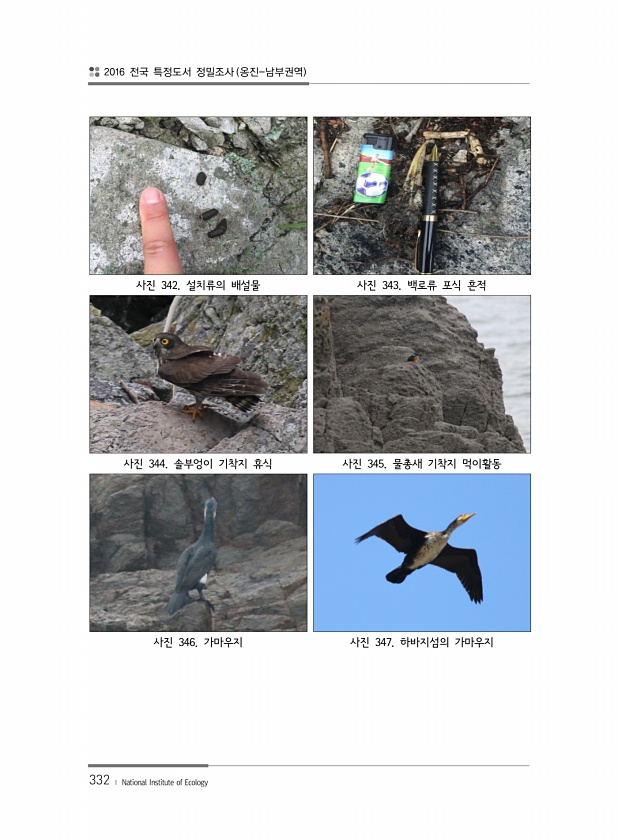 2016 전국 특정도서 정밀조사 옹진-남부권역 332 ? National Institute of Ecology 사진 342. 설치류의 배설물 사진 343. 백로류 포식 흔적 사진 344. 솔부엉이 기착지 휴식 사진 345. 물총새 기착지 먹이활동 사진 346. 가마우지 사진 347. 하바지섬의가마우지