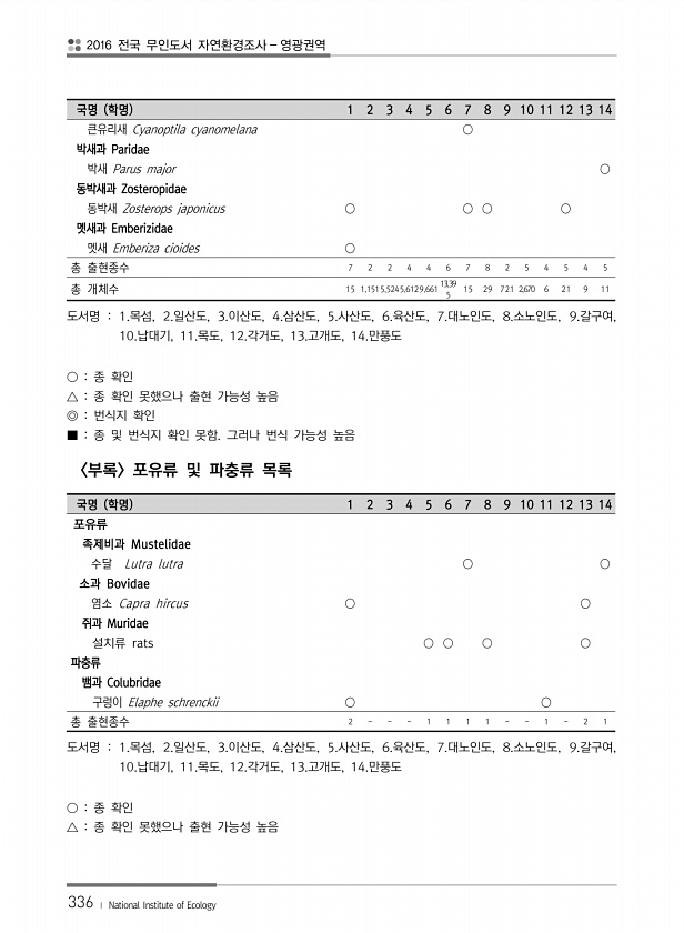 2016 전국 무인도서 자연환경조사 영광권역 336 ? National Institute of Ecology 국명 학명 1 2 3 4 5 6 7 8 9 10 11 12 13 14 큰유리새 Cyanoptila cyanomelana ○ 박새과 Paridae 박새 Parus major ○ 동박새과 Zosteropidae 동박새 Zosterops japonicus ○ ○ ○ ○ 멧새과 Emberizidae 멧새 Emberiza cioides ○ 총 출현종수 7 2 2 4 4 6 7 8 2 5 4 5 4 5 총 개체수 15 1,1515,5245,6129,661 13,39 5 15 29 721 2,670 6 21 9 11 국명 학명 1 2 3 4 5 6 7 8 9 10 11 12 13 14 포유류 족제비과 Mustel...