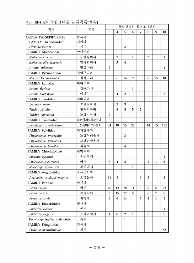 310 표 Ⅲ-102 국립생태원 조류목록 계속 학명 국명 국립생태원 월별조사결과 3 4 5 6 7 8 9 10 ORDER PASSERIFORMES 참새목 FAMILY Hirundinidae 제비과 Hirundo rustica 제비 3 FAMILY Motacillidae 할미새과 Motacilla cinerea 노랑할미새 2 1 3 1 Motacilla alba leucopsis 알락할미새 3 4 Anthus rubescens 밭종다리 2 4 FAMILY Pycnonotidae 직박구리과 Microscelis amaurotis 직박구리 8 6 14 9 9 8 25 10 FAMILY Laniidae 때까치과 Lanius tigrinus 칡때까치 1 Lanius bucephalus 때까치 4 2 3 1 2 FAM...