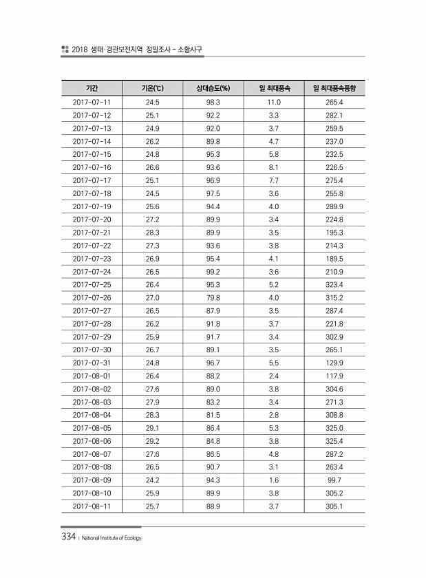2018 생태·경관보전지역 정밀조사 소황사구 334 ? National Institute of Ecology 기간 기온 ℃ 상대습도 % 일 최대풍속 일 최대풍속풍향 2017-07-11 24.5 98.3 11.0 265.4 2017-07-12 25.1 92.2 3.3 282.1 2017-07-13 24.9 92.0 3.7 259.5 2017-07-14 26.2 89.8 4.7 237.0 2017-07-15 24.8 95.3 5.8 232.5 2017-07-16 26.6 93.6 8.1 226.5 2017-07-17 25.1 96.9 7.7 275.4 2017-07-18 24.5 97.5 3.6 255.8 2017-07-19 25.6 94.4 4.0 289.9 2017-07-20 27.2 89.9 3.4 224...
