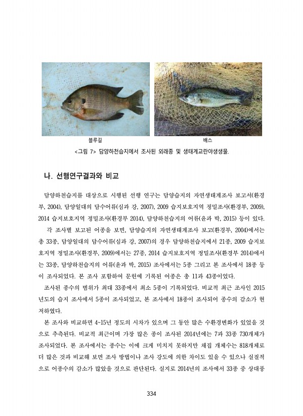 334 블루길 배스 그림 7 담양하천습지에서 조사된 외래종 및 생태계교란야생생물. 나. 선행연구결과와 비교 담양하천습지를 대상으로 시행된 선행 연구는 담양습지의 자연생태계조사 보고서 환경 부, 2004 , 담양일대의 담수어류 심과 강, 2007 , 2009 습지보호지역 정밀조사 환경부, 2009 , 2014 습지보호지역 정밀조사 환경부 2014 , 담양하천습지의 어류 윤과 박, 2015 등이 있다. 각 조사별 보고된 어종을 보면, 담양습지의 자연생태계조사 보고 환경부, 2004 에서는 총 33종, 담양일대의 담수어류 심과 강, 2007 의 경우 담양하천습지에서 21종, 2009 습지보 호지역 정밀조사 환경부, 2009 에서는 27종, 2014 습지보호지역 정밀조사 환경부 2014 에서 는 33종, 담양하천습...