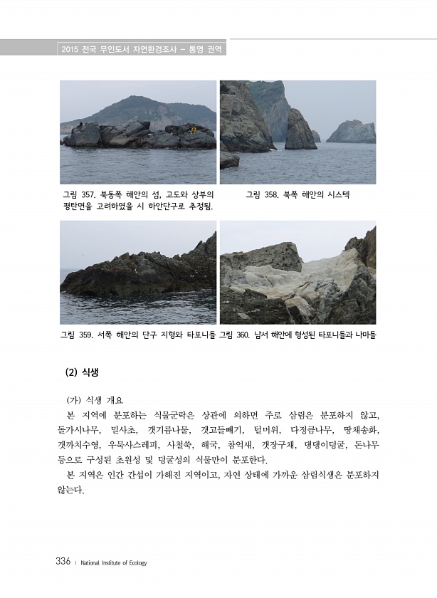 2015 전국 무인도서 자연환경조사 통영 권역 336 ? National Institute of Ecology 그림 357. 북동쪽 해안의 섬, 고도와 상부의 평탄면을 고려하였을 시 하안단구로 추정됨. 그림 358. 북쪽 해안의 시스텍 그림 359. 서쪽 해안의 단구 지형와 타포니들 그림 360. 남서 해안에 형성된 타포니들과 나마들 2 식생 가 식생 개요 본 지역에 분포하는 식물군락은 상관에 의하면 주로 삼림은 분포하지 않고, 돌가시나무, 밀사초, 갯기름나물, 갯고들빼기, 털머위, 다정큼나무, 땅채송화, 갯까치수영, 우묵사스레피, 사철쑥, 해국, 참억새, 갯장구채, 댕댕이덩굴, 돈나무 등으로 구성된 초원성 및 덩굴성의 식물만이 분포한다. 본 지역은 인간 간섭이 가해진 지역이고, 자연 상태에 가까운 삼림식생...