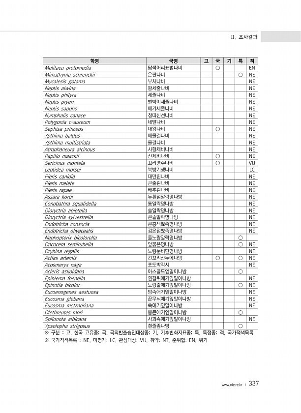 Ⅱ. 조사결과 www.nie.re.kr ? 337 학명 국명 고 국 기 특 적 Melitaea protomedia 담색어리표범나비 ○ EN Mimathyma schrenckii 은판나비 ○ NE Mycalesis gotama 부처나비 NE Neptis alwina 왕세줄나비 NE Neptis philyra 세줄나비 NE Neptis pryeri 별박이세줄나비 NE Neptis sappho 애기세줄나비 NE Nymphalis canace 청띠신선나비 NE Polygonia c-aureum 네발나비 NE Sephisa princeps 대왕나비 ○ NE Ypthima baldus 애물결나비 NE Ypthima multistriata 물결나비 NE Atrophaneura alcinous 사향제비나비 NE Papil...