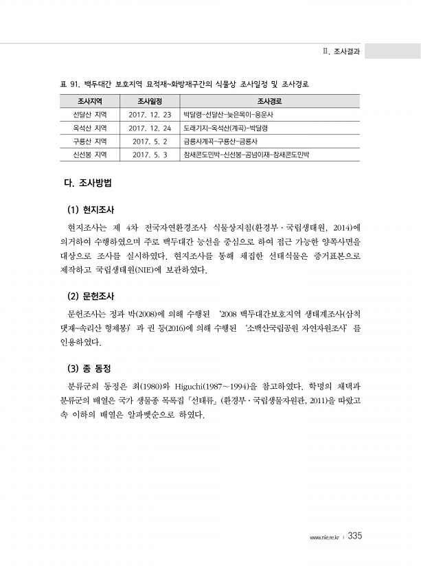 Ⅱ. 조사결과 www.nie.re.kr ? 335 조사지역 조사일정 조사경로 선달산 지역 2017. 12. 23 박달령-선달산-늦은목이-용운사 옥석산 지역 2017. 12. 24 도래기지-옥석산 계곡 -박달령 구룡산 지역 2017. 5. 2 금룡사계곡-구룡산-금룡사 신선봉 지역 2017. 5. 3 참새콘도민박-신선봉-곰넘이재-참새콘도민박 표 91. 백두대간 보호지역 묘적재화방재구간의 식물상 조사일정 및 조사경로 다. 조사방법 1 현지조사 현지조사는 제 4차 전국자연환경조사 식물상지침 환경부·국립생태원, 2014 에 의거하여 수행하였으며 주로 백두대간 능선을 중심으로 하여 접근 가능한 양쪽사면을 대상으로 조사를 실시하였다. 현지조사를 통해 채집한 선태식물은 증거표본으로 제작하고 국립생태원 NIE 에 보관하였다...