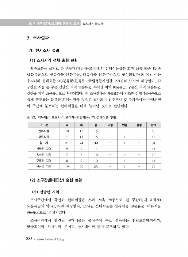 2017 백두대간보호지역 생태계 조사 묘적재 화방재 336 ? National Institute of Ecology 3. 조사결과 가. 현지조사 결과 1 조사지역 전체 출현 현황 확증표본을 근거로 한 백두대간 밀재묘적재 의 선태식물상은 21과 24속 30종 1변종 31분류군으로 선류식물 15분류군, 태류식물 16분류군으로 구성되었다 표 92 이는 우리나라 선태식물 903분류군 환경부·국립생물자원관, 2011 의 3.0%에 해당한다. 각 구간별 식물 종 수는 선달산 지역 11분류군, 옥석산 지역 10분류군, 구룡산 지역 11분류군, 신선봉 지역 24분류군으로 확인되었다. 본 조사결과는 확증표본에 기초한 선태식물목록으로 실제 분포하는 분류군보다는 적을 것으로 생각되며 전수조사 및 추가조사가 수행되면 이 구간에 ...