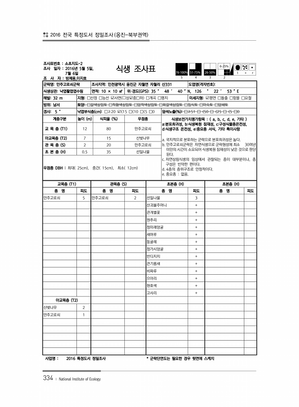 2016 전국 특정도서 정밀조사 옹진-북부권역 334 ? National Institute of Ecology 조사표번호 소초지도-2 조사 일자 2016년 5월 5일, 7월 6일 조 사 자 방제용,이지효 식생 조사표 군락명만주고로쇠군락 조사지역인천광역시 옹진군 자월면 자월리 산331 도엽명 격자번호 식생상관낙엽활엽엽수림 면적10 × 10 ㎡ 위·경도 GPS 35 ° 48 ′ 40 ″N, 126 ° 22 ′ 53 ″E 해발32 m 지형□산정 □능선 ?사면 ?상?중□하 □계곡 □평지 미세지형?평면 □돌출 □함몰 □요철 방위남서 토양□갈색삼림토 □적황색삼림토 □암적색삼림토 □회갈색삼림토 □침식토 □미숙토 □암쇄토 경사5 ° 낙엽부식층 cm □≥20 ? 15 □ 10 □ 5 □0 암석노출 % □≥51 □〈50 □〈...