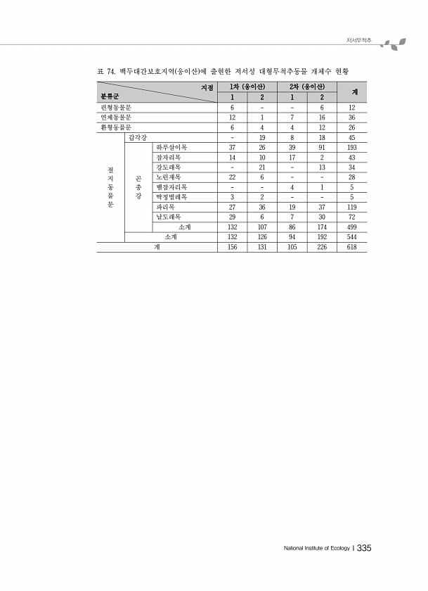 저서무척추 National Institute of EcologyⅠ335 지점 분류군 1차 웅이산 2차 웅이산 계 1 2 1 2 편형동물문 6 6 12 연체동물문 12 1 7 16 36 환형동물문 6 4 4 12 26 절 지 동 물 문 갑각강 19 8 18 45 곤 충 강 하루살이목 37 26 39 91 193 잠자리목 14 10 17 2 43 강도래목 21 13 34 노린재목 22 6 28 뱀잠자리목 4 1 5 딱정벌레목 3 2 5 파리목 27 36 19 37 119 날도래목 29 6 7 30 72 소계 132 107 86 174 499 소계 132 126 94 192 544 계 156 131 105 226 618 표 74. 백두대간보호지역 웅이산 에 출현한 저서성 대형무척추동물 개체수현황