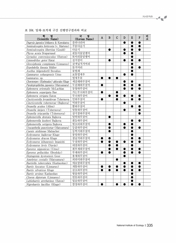 저서무척추 National Institute of EcologyⅠ335 학 명 Scientific Name 국 명 Korean Name A B C D E F 비 고 Dugesia japonica Ichikawa & Kawakatsu 플라나리아 ● ● ● Semisulcospira forticosta v. Martens 주름다슬기 ● ● Semisulcospira libertina Gould 다슬기 ● ● ● ● Physa acuta Draparnaud 왼돌이물달팽이 ● ● Gyraulus convexiusculus Hutton 또아리물달팽이 ● Limnodrilus gotoi Hatai 실지렁이 ● ● ● ● Glossiphonia complanata Linnaeus 갈색넙적거머리 ● Erpobdella l...