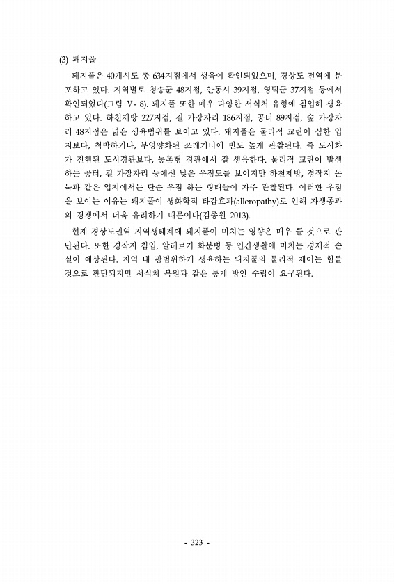 3 돼지풀 돼지풀은 40개시도 총 634지점에서 생육이 확인되었으며, 경상도 전역에 분 포하고 있다. 지역별로 청송군 48지점, 안동시 39지점, 영덕군 37지점 등에서 확인되었다 그림 Ⅴ- 8 돼지풀 또한 매우 다양한 서식처 유형에 침입해 생육 하고 있다. 하천제방 227지점, 길 가장자리 186지점, 공터 89지점, 숲 가장자 리 48지점은 넓은 생육범위를 보이고 있다. 돼지풀은 물리적 교란이 심한 입 지보다, 척박하거나, 부영양화된 쓰레기터에 빈도 높게 관찰된다. 즉 도시화 가 진행된 도시경관보다, 농촌형 경관에서 잘 생육한다. 물리적 교란이 발생 하는 공터, 길 가장자리 등에선 낮은 우점도를 보이지만 하천제방, 경작지 논 둑과 같은 입지에서는 단순 우점 하는 형태들이 자주 관찰된다. 이러한 우점 을 ...