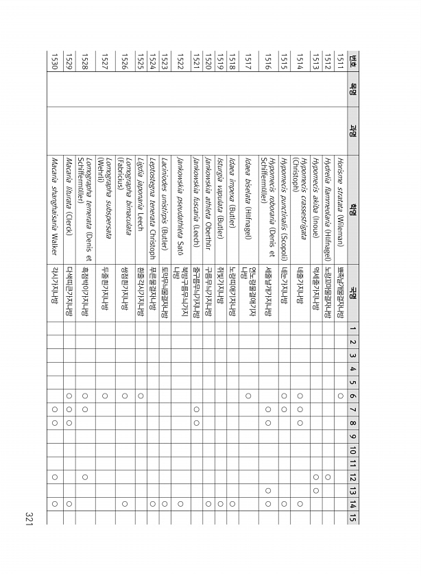 321 번호 목명 과명 학명 국명 1 2 3 4 5 6 7 8 9 10 11 12 13 14 15 1511 Horisme stratata Wileman 뾰족날개물결자나방 ○ 1512 Hydrelia flammeolaria H?fnagel 노랑꼬마물결자나방 ○ 1513 Hypomecis akiba Inoue 먹세줄가지나방 ○ ○ 1514 Hypomecis crassestrigata Christoph 네줄가지나방 ○ ○ ○ ○ 1515 Hypomecis punctinalis Scopoli 네눈가지나방 ○ ○ ○ 1516 Hypomecis roboraria Denis et Schifferm?ller 세줄날개가지나방 ○ ○ ○ ○ 1517 Idaea biselata H?fnagel 연노랑물결애기자 나방 ○ 1518...