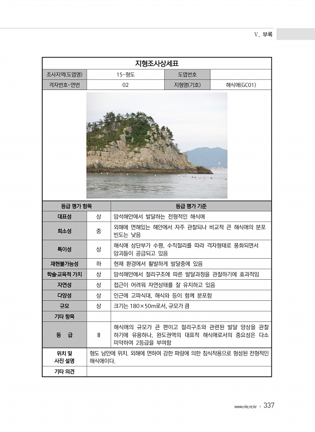 Ⅴ. 부록 www.nie.re.kr ? 337 지형조사상세표 조사지역 도엽명 15-형도 도엽번호 격자번호-연번 02 지형명 기호 해식애 GC01 등급 평가 항목 등급 평가 기준 대표성 상 암석해안에서 발달하는 전형적인 해식애 희소성 중 외해에 면해있는 해안에서 자주 관찰되나 비교적 큰 해식애의 분포 빈도는 낮음 특이성 상 해식애 상단부가 수평, 수직절리를 따라 격자형태로 풍화되면서 암괴들이 공급되고 있음 재현불가능성 하 현재 환경에서 활발하게 발달중에 있음 학술?교육적 가치 상 암석해안에서 절리구조에 따른 발달과정을 관찰하기에 효과적임 자연성 상 접근이 어려워 자연상태를 잘 유지하고 있음 다양성 상 인근에 고파식대, 해식와 등이 함께 분포함 규모 상 크기는 180×50m로서, 규모가 큼 기타 항목 등 급 Ⅱ...