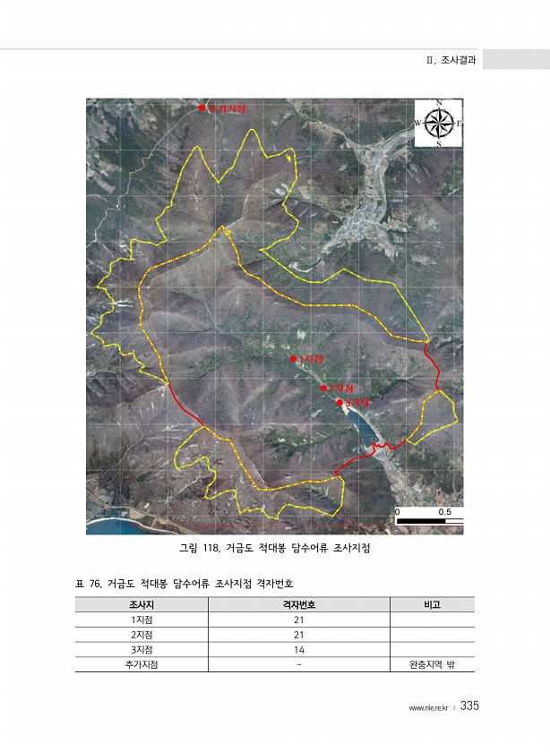 Ⅱ. 조사결과 www.nie.re.kr ? 335 그림 118. 거금도 적대봉 담수어류 조사지점 조사지 격자번호 비고 1지점 21 2지점 21 3지점 14 추가지점 완충지역 밖 표 76. 거금도 적대봉 담수어류 조사지점격자번호
