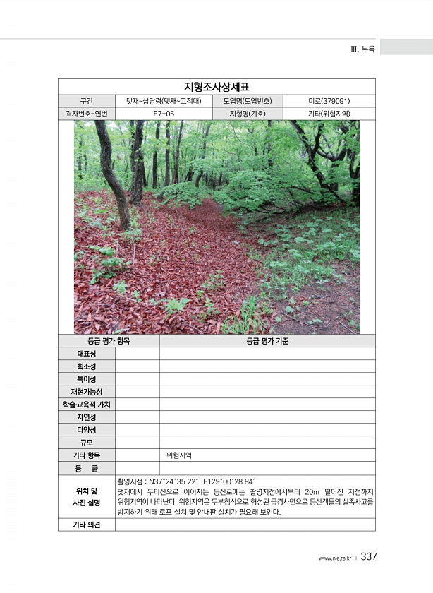 Ⅲ. 부록 www.nie.re.kr ? 337 지형조사상세표 구간 댓재삽당령 댓재고적대 도엽명 도엽번호 미로 379091 격자번호-연번 E7-05 지형명 기호 기타 위험지역 등급 평가 항목 등급 평가 기준 대표성 희소성 특이성 재현가능성 학술?교육적 가치 자연성 다양성 규모 기타 항목 위험지역 등 급 위치 및 사진 설명 촬영지점 N37°24′35.22″, E129°00′28.84″ 댓재에서 두타산으로 이어지는 등산로에는 촬영지점에서부터 20m 떨어진 지점까지 위험지역이 나타난다. 위험지역은 두부침식으로 형성된 급경사면으로 등산객들의 실족사고를 방지하기 위해 로프 설치 및 안내판 설치가 필요해 보인다. 기타의견
