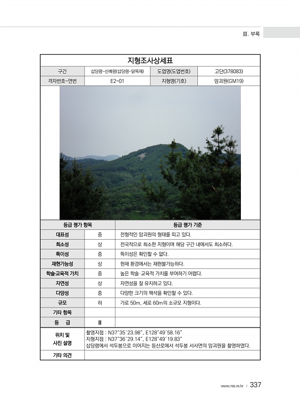 Ⅲ. 부록 www.nie.re.kr ? 337 지형조사상세표 구간 삽당령신배령 삽당령닭목재 도엽명 도엽번호 고단 378083 격자번호-연번 E2-01 지형명 기호 암괴원 GM19 등급 평가 항목 등급 평가 기준 대표성 중 전형적인 암괴원의 형태를 띠고 있다. 희소성 상 전국적으로 희소한 지형이며 해당 구간 내에서도 희소하다. 특이성 중 특이성은 확인할 수 없다. 재현가능성 상 현재 환경에서는 재현불가능하다. 학술?교육적 가치 중 높은 학술·교육적 가치를 부여하기 어렵다. 자연성 상 자연성을 잘 유지하고 있다. 다양성 중 다양한 크기의 핵석을 확인할 수 있다. 규모 하 가로 50m, 세로 60m의 소규모 지형이다. 기타 항목 등 급 Ⅲ 위치 및 사진 설명 촬영지점 N37°35′23.98″, E128°49′58...