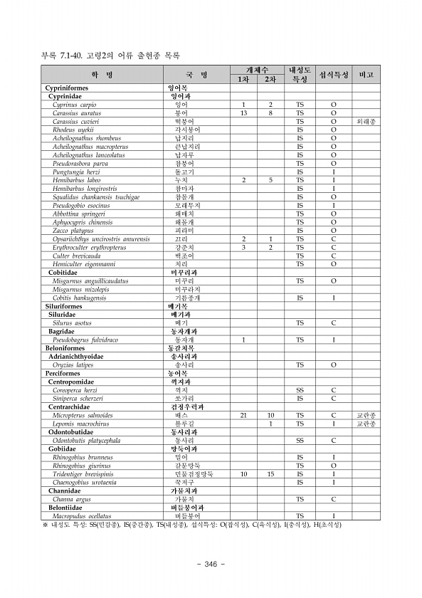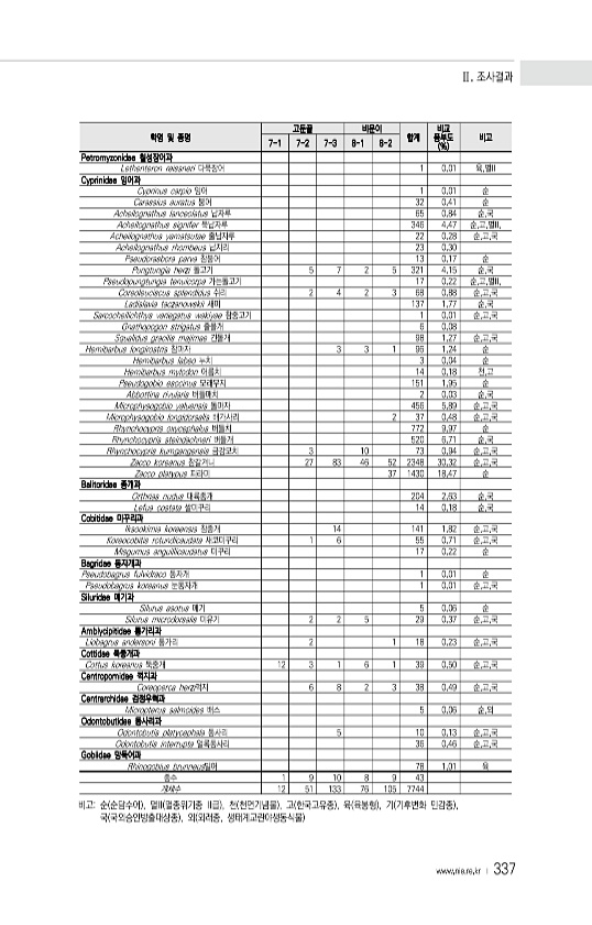 Ⅱ. 조사결과 www.nie.re.kr ? 337 학명 및 종명 고둔골 비운이 합계 비교 풍부도 % 비고 7-1 7-2 7-3 8-1 8-2 Petromyzonidae 칠성장어과 Lethenteron reissneri 다묵장어 1 0.01 육,멸II Cyprinidae 잉어과 Cyprinus carpio 잉어 1 0.01 순 Carassius auratus 붕어 32 0.41 순 Acheilognathus lanceolatus 납자루 65 0.84 순,국 Acheilognathus signifer 묵납자루 346 4.47 순,고,멸II, Acheilognathus yamatsutae 줄납자루 22 0.28 순,고,국 Acheilognathus rhombeus 납지리 23 0.30 Pseudorasbora p...