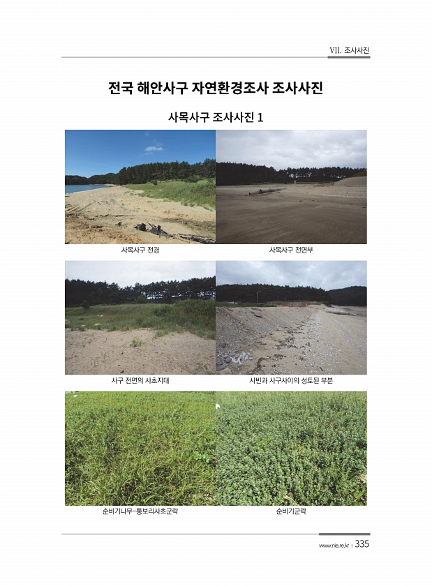 VII. 조사사진 www.nie.re.kr ?335 사목사구 전경 사목사구 전면부 사구 전면의 사초지대 사빈과 사구사이의 성토된 부분 순비기나무-통보리사초군락 순비기군락1
